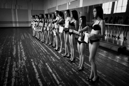 Six black heels shuffled across the wooden floor of the ballet studio. The heels were all size 7, slightly scuffled. They weren’t washed that often, since they were owned by the modeling agency. No one from the Volgograd region could afford their own heels, so it was better than nothing. The wearers of the shoes were 56 kilos heavy and no shorter than 173 centimeters, as one had to be tall to be picked. These girls were fifteen years old, tops. Inna was fourteen and a half. They tottered forward to face the scouts, trying to hide the discomfort they felt behind the cake of their makeup. Their hopeful mothers had spent the week’s salary to buy the makeup for them. Sway the hips, keep the elbow curved and look straight ahead with a dangerous look. Inna’s coach, Kahlya, always used the word “dangerous.” Inna didn’t really understand what it meant to look dangerous but Kahlya had been a Siberian favorite across Southeast Asia and Europe. She claimed that she walked in Paris but Inna wasn’t so sure. She worked with Kahlya on Mondays and Wednesdays after school at 4:30 p.m. for group lessons and on Friday mornings before school at 7 a.m. for a private lesson. It was on Fridays when Kahlya told her inappropriate stories about piercings in private places and boys she met overseas.