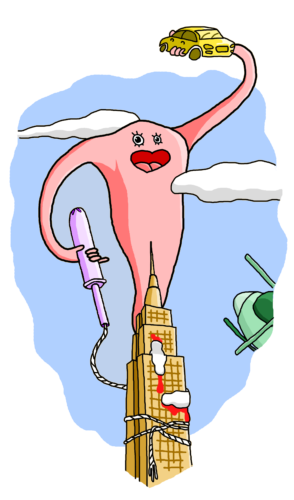 With a half-eaten, white chocolate tampon pretzel in hand, I perused the Menstruation Celebration, picking up free condoms and nearly choking when I read “Period week = blow job week” on a poster debunking period myths. I swallowed slowly, and made my way around the silver tables to the other posters offering hand written advice for improving your periods and stories about periods in the news. In one corner, attendees played pin-the-ovaries-on-the-uterus and toss-the-tampon-in-the-vagina games, while teachers and students posed for photos with a cardboard uterus. A University Health Services nurse smiled from her booth, ready to answer any questions the partygoers had. After getting their fill of vagina-inspired cupcakes and before leaving, students signed their names on a petition to implement free menstrual products in all non-residential bathrooms.