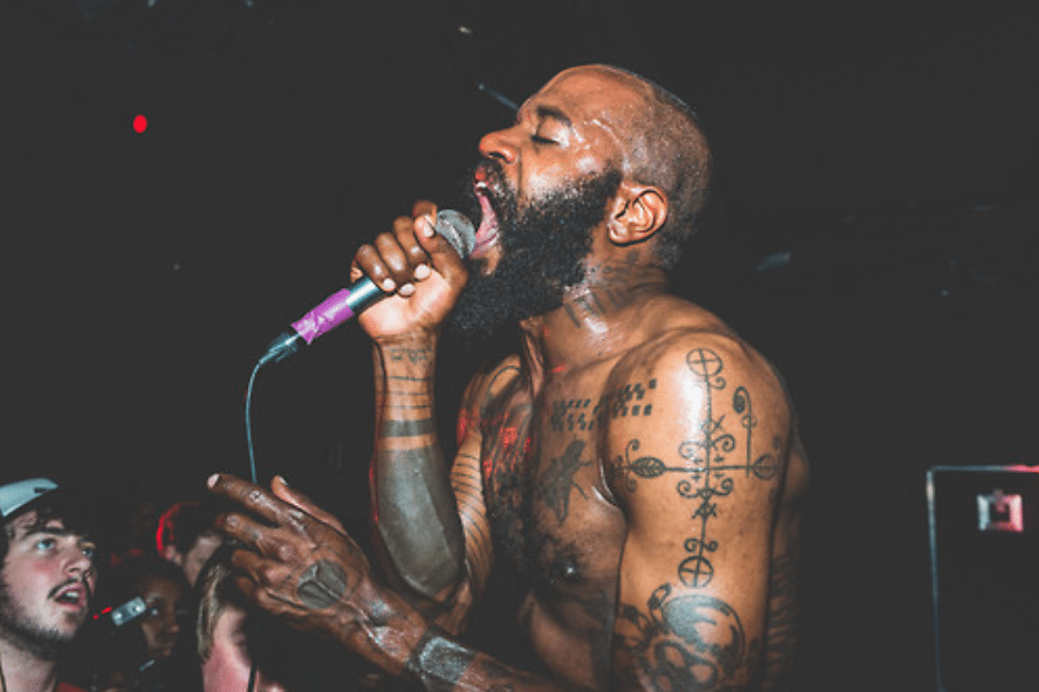 The track itself, which may or may not be part of Bottomless Pit, mirrors in theme and structure the hostility the group has for easy fame and audience gratification. “Hot Head” opens with a jarring synth, something like the sound of an industrial-grade leafblower starting up. This leads into a relentless and irregular drum roll, and rapper MC Ride’s rapid, snare-drum vocals: “blowblowblowblowblowblowblowblow oh no.” The opening recalls Powers that B’s “Inanimate Sensation,” where the refrain was “blown-out base,” a phrase that seemed to refer at once to apocalyptic drug consumption and a literal explosion. Here the meaning is somewhat clearer: the blows (and, if you will, the blow) are coming from the titular “hot head,” who MC Ride proceeds to describe in his cryptic, nightmarish style.