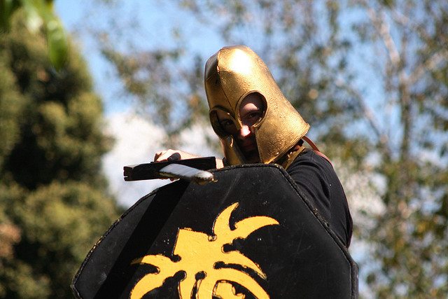 I politely smiled. I laughed a little. “Oh,” I responded uneasily. I then realized that my laughter was possibly inappropriate. She reached into a satchel around her waist and pulled out a small business card. “Here’s our information! You should totally check it out!” She beamed at me, momentarily abandoning her medieval persona. The card, against a backdrop of a clipart wheat field, read “Shire of the Empire’s Grove, Amtgard–LARP Group” and gave the group’s contact information.