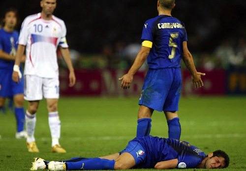 I even have a slightly guilty love for what in Italy they call furbizia: a personal quality that roughly translates to craftiness. This term is used to describe the barely legal methods of defending which are rife across Europe but especially in Italy, with subtle psychological or physical provocation the most notable example. In the 2006 World Cup final, for instance, the Italian defender Marco Materazzi muttered inflammatory words to the French player Zinedine Zidane, supposedly referencing the latter’s family members. Zidane responded by headbutting Materazzi in the chest, a gesture that earned him a red card and probably contributed to France’s eventual defeat. This is classic furbizia. Materazzi did not break any rules in exploiting his opponent’s temper but was nevertheless able to provoke a great result for the Italian team without the ball even being in play. A similar incident took place when Italy came up against Germany in the semi-final of the same tournament. The German midfielder Michael Ballack committed a foul against Gattuso, who immediately stood up as though he were looking for a fight. Ballack responded in kind, so the two were face to face with tensions very high. Suddenly, out of nowhere but in full sight of the referee, Gattuso pulled the other player into a bear hug, which of course could not be rejected without accusations of a desperate lack of sportsmanship. When the Italian eventually broke away, he casually but firmly tugged Ballack’s hair and wandered off, leaving the German player even more furious than before.
