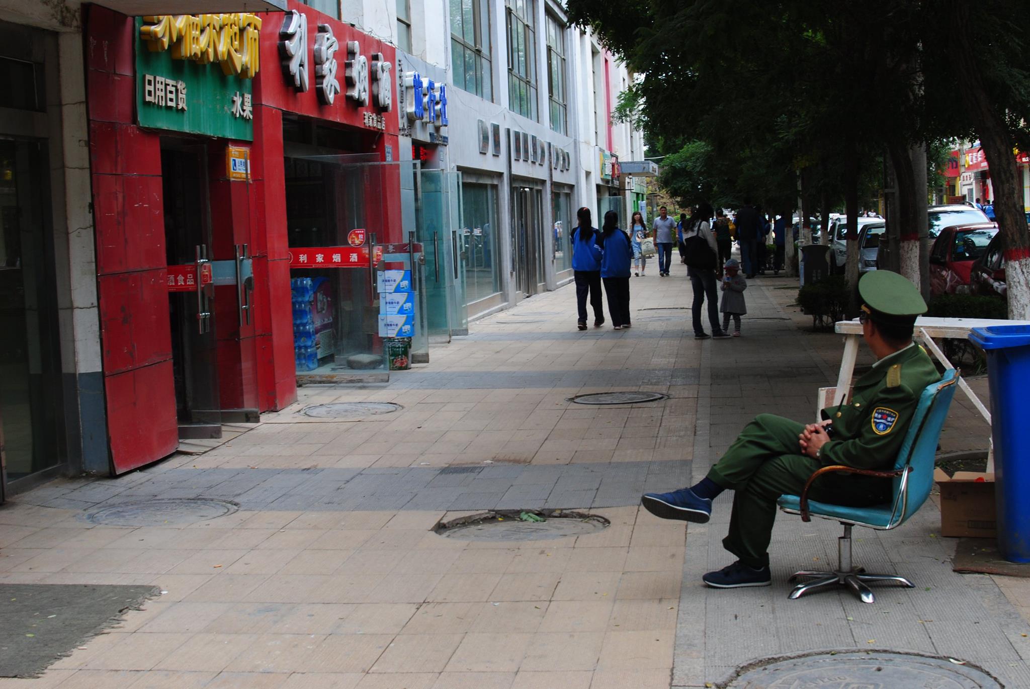 Farther down the road, the cracks grow deeper, and the lines more faded, until suddenly, they stop. Out of nowhere pops an abandoned town, complete with broken glass, shattered windows, and carnival lights long since burnt out. The streets are filled with garbage, and the buildings look burnt out. A few men pray in the street for lack of a mosque, and there is a broken radiator perched on the sidewalk. Off to the side, there’s something that looks like a government building, because why else would two armed soldiers nap in the sunlight in front of it? Welcome to the China behind the gate.