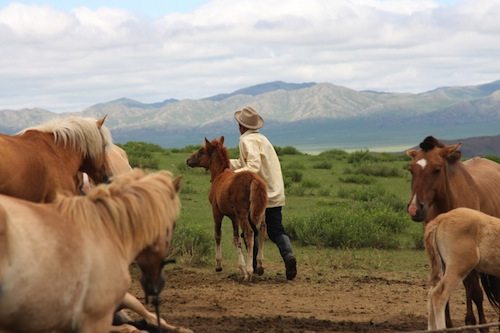 That the state is transitional—that the transformation into a ‘bottled’ nation is incomplete—becomes apparent if you travel a bit outside Ulaan Baatar. A massive yurt shantytown skirts the city. Within about a mile of the glassy, Gucci-clad city center, Mongolians are still living in thick fabric tents, with little or no electricity and with only their small yards for garbage dumps —although thankfully most at least have access to clean water. Empty bottles of vodka, a drink which in post-Soviet Mongolia rivals airag for popularity, litter the Steppes near the city, scattered by the wind like tragic tumbleweeds. The roads outside the city are generally in disrepair, so people have taken to simply driving next to them, creating ruddy dirt paths all across the landscape. When viewed from a plane, the highways look more like muddy riverbeds than the straight grey lines I’m used to seeing in America. And once we got about twenty miles outside Ulaan Baatar, these riverbeds faded into thin streams among the utterly wild. Finally there was no longer garbage strewn about. The trees on the hillsides began to thin. The Gobi started to flatten. I saw roaming herds of horses and met a man who still uses a camel for transportation. This was no glass-bottled Mongolia; this was rustic life shared from an airag bowl.