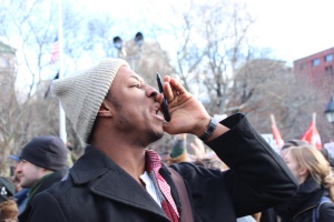 After the microphones of some organizers stop working, a marcher invigorates the crowd, yelling that he does not “need no microphone” to keep protesting.
