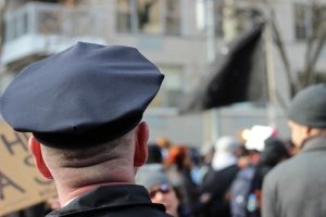 A NYPD officer looks on as the march progresses past the arch of Washington Square Park.
