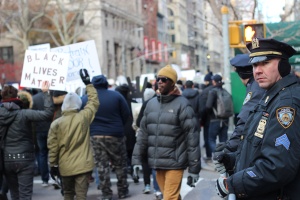 Two NYPD officers look on at the march. A popular chant heard throughout the event is “How do you spell racist? / N-Y-P-D!”