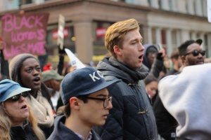 From left to right, Lacey Wisdom (’17), Andrew Sondern (’15), and Tyler House (’15) participate in the march.