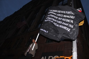 Night descends and the protest continues. A man climbs on top of a phone booth and waves a massive back flag, inscribed with a quote from Martin Luther King Jr.