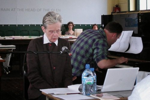 The poet will be Susan Howe. The speaker will be also she. Therefore, there is a microphone and a stack of paper on the table, at which Susan Howe sits. The musician and the music will be David Grubbs. There are paper, piano, and a laptop. There is no microphone. There are marks on Susan Howe’s paper and on David Grubbs’ paper, which they may or may not have put there or left there.